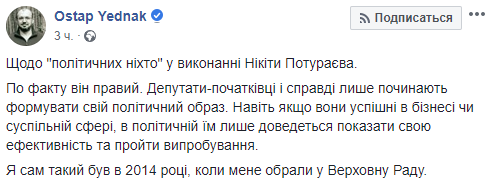 "Что касается "политических никто" в исполнении Никиты Потураева. По факту он прав. Депутаты-новички действительно только начинают формировать свой политический образ. Даже если они успешны в бизнесе или общественной сфере, в политической им только предстоит показать свою эффективность и пройти испытания. Я сам такой был в 2014 году, когда меня избрали в Верховную Раду", - написал депутат Остап Еднак.