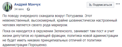 "По поводу очередного скандала вокруг Потураева. Этот невежественный, высокомерный, крайне шовинистически настроенный человек является своего рода маркером.