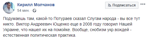 "Подумаешь там, какой-то Потураев сказал Слугам народа - вы все тут никто. Виктор Андреевич Ющенко еще в 2008 году говорил Нашей Украине, что нашел их на помойке. Вообще, снобизм укр.вождей - естественная политическая практика", - написал политический эксперт Кирилл Молчанов.