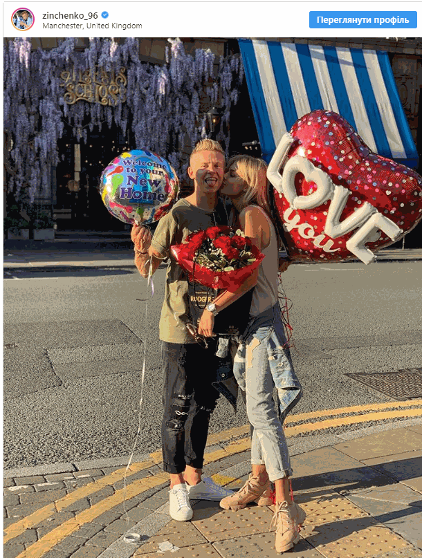 Cовместная фотография футболиста и журналистки сделана в Манчестере. На ней акула пера нежно целует своего избранника. В руках у нее корзина с цветами, а сам Александр Зинченко держит шарик с надписью "Добро пожаловать в твой новый дом".