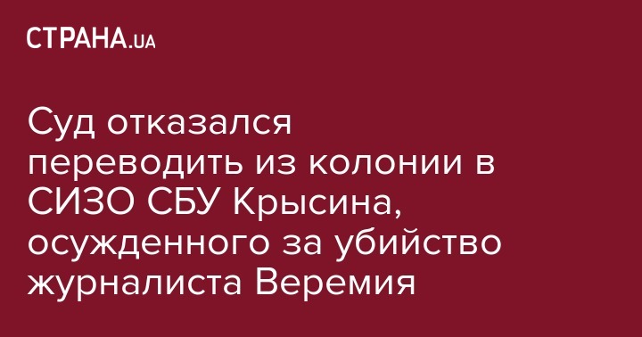 Дарницкий районный суд Киева отказал в переводе "титушки" Юрия Крысина, осужденного за убийство журналиста "Вестей" Вячеслава Веремия, из Торецкой исправительной колонии в следственный изолятор СБУ в Киеве. Об этом сообщает УНИАН.