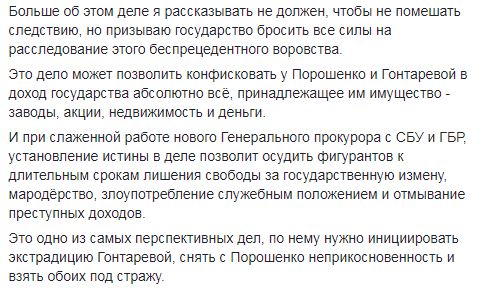 По его мнению, это дело может позволить конфисковать у Порошенко и Гонтаревой в доход государства абсолютно всё, принадлежащее им имущество - заводы, акции, недвижимость и деньги. "Это одно из самых перспективных дел, по нему нужно инициировать экстрадицию Гонтаревой, снять с Порошенко неприкосновенность и взять обоих под стражу", - резюмирует он.
