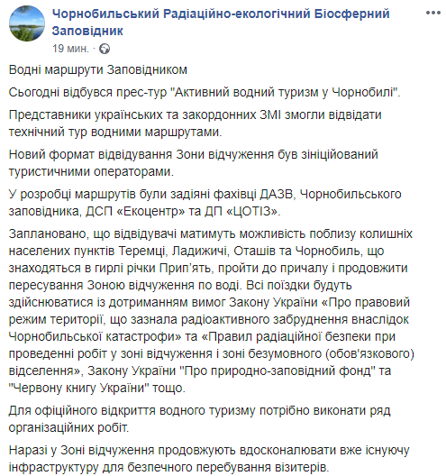 Также отмечается, что для официального открытия водного туризма нужно выполнить ряд организационных работ. Сейчас в зоне отчуждения продолжают совершенствовать уже существующую инфраструктуру для безопасного пребывания визитеров.