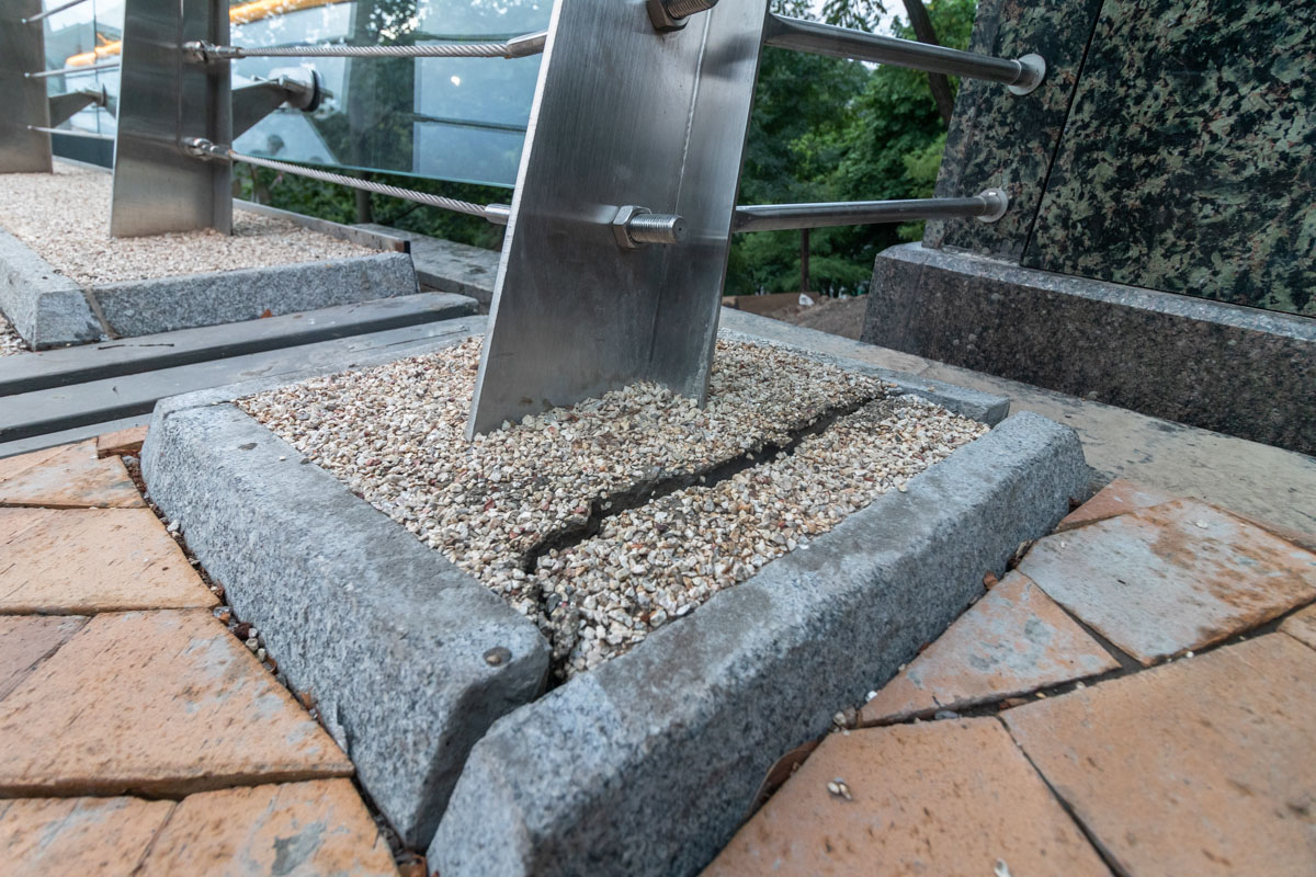 Мост между Аркой дружбы народов и Крещатым парком открыли в мае. Виталий Кличко вместе со своим братом Владимиром испытали прочность стеклянного пола на мосту и попрыгали на нем. Однако уже на следующий день на стеклах в полу обнаружили трещины.