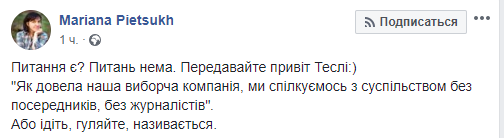"Послушала заявление Богдана о том, что журналисты больше не нужны. И с обществом они будут общаться без посредников. И выборы это показали. Логика в этом есть в принципе. Если ты не можешь общаться со СМИ, то они тебе естественно не нужны. Но тогда возникает вопрос, а с кем ты вообще можешь общаться? Не все понимают распальцовку и цыканье зубом".