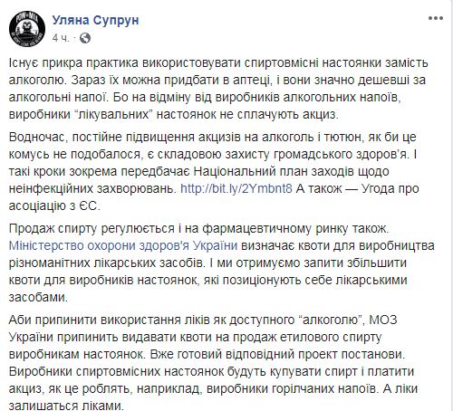 "Существует досадная практика использовать спиртосодержащие настойки вместо алкоголя", - написала Супрун.
