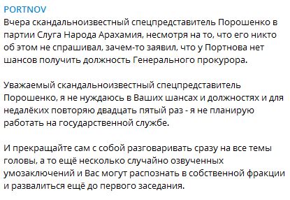"Вчера скандально известный спецпредставитель Порошенко в партии Слуга Народа Арахамия, несмотря на то, что его никто об этом не спрашивал, зачем-то заявил, что у Портнова нет шансов получить должность генерального прокурора", - написал Портнов. Он добавил, что "не нуждается" в шансах и должностях и "для недалеких повторяет двадцать пятый раз", что "не планирует работать на государственной службе".