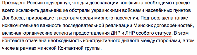 Москва: "Подтверждена также исключительная важность последовательной реализации Минских договоренностей, включая юридические аспекты предоставления ДНР и ЛНР особого статуса".