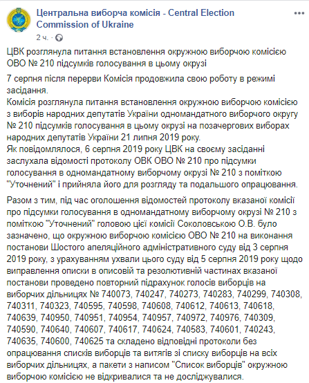 Центральная избирательная комиссия Украины опубликует результаты выборов в округе № 210 после того, как они будут установлены. Об этом сообщается на странице Комиссии в Facebook.