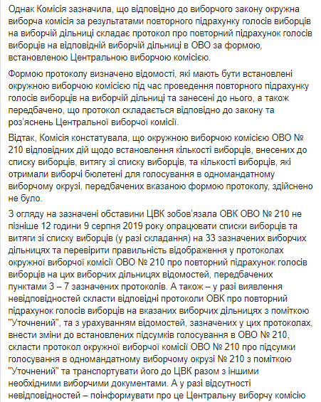 Отмечается, что в опубликованном газетами "Урядовий кур’єр" и "Голос Украины" списке народных депутатов, избранных на внеочередных выборах народных депутатов 21 июля отсутствует информация об избранном народном депутате в одномандатном избирательном округе №210.