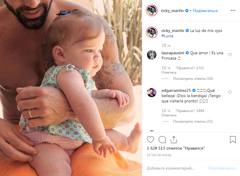 "Свет моих глаз Люсия", - написал Рики Мартин под снимком, на котором дочь сидит у него на коленях.