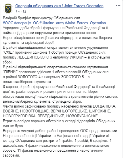 Сообщается, что силы противника обстреливали позиции украинских солдат из крупнокалиберных пулеметов и стрелкового оружия. В районе ответственности оперативно-тактической группировки "Восток" противник произвел 1 обстрел позиций Объединенных сил вблизи Лебединского со стороны Ужевки – из стрелкового оружия.