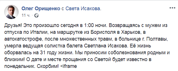 "Возвращаясь с мужем из отпуска по Италии, на маршрутке из Борисполя в Харьков, в автокатострофе, после множественных травм, в больнице г. Полтавы, умерла ведущая солистка балета Светлана Исакова. Ее жизнь оборвалась на 31 году жизни. Мы приносим соболезнования родным и близким! О дате и месте прощания со Светой будет известно в понедельник. Скорбим", - написал директор театра.