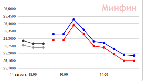 15 августа на межбанке доллар к 11:00 подорожал до 25,39/25,43 грн, но к концу торгов откатился до 25,15/25,185.
