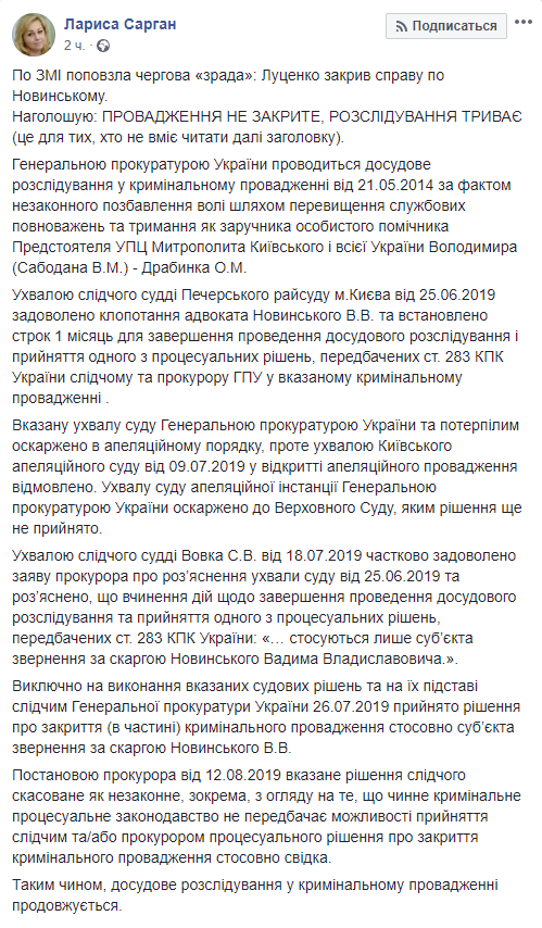 "Подчеркиваю: производство не закрыто, расследование продолжается. Постановлением прокурора от 12.08.2019 указанное решение следователя (о закрытии уголовного производства – Ред.) отменено как незаконное, в частности, ввиду того, что действующее уголовное процессуальное законодательство не предусматривает возможности принятия следователем и/или прокурором процессуального решения о закрытии уголовного производства в отношении свидетеля (Новинский в производстве имел статус свидетеля, подозрение объявленj ​​не было – Ред.)", - написала Сарган.