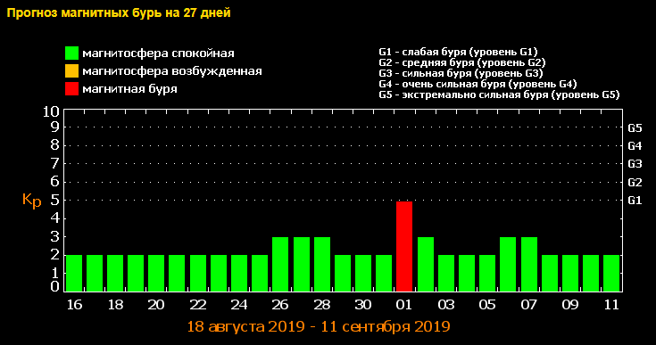 В сентябре больше не предвидится вспышек на Солнце, поэтому сильных магнитных бурь не будет, кроме первого числа месяца. При этом геомагнитные колебания достигнут 5 баллов и в интенсинвую бурю не перерастут.