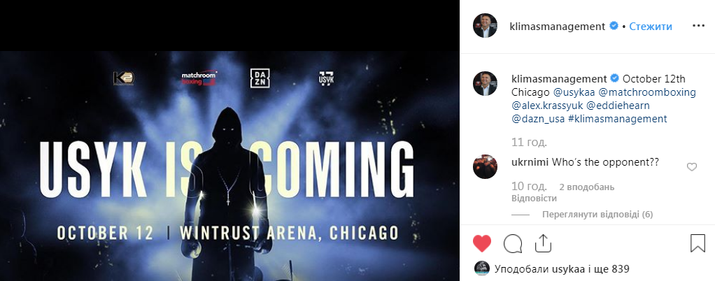 Знаменитый украинкий боксер Александр Усик свой следующий бой, и это будет его дебют в супертяжелом весе проведет 12 октября 2019 в Чикаго. Об этом говорится в Instagram менеджера боксера Эгиса Климаса.