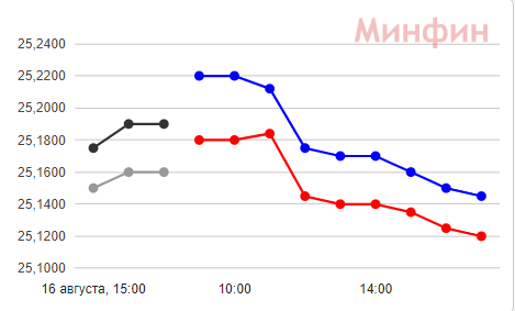Торги на межбанке, которые влияют на курсы в банках и обменках, откроются в 10:00. В пятницу, 16 августа, он закрылся с котировками 25,16 грн (покупка) и 25,19 грн (продажа).