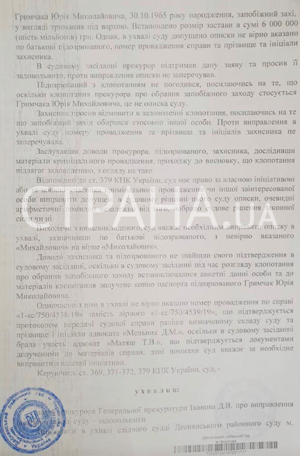 В субботу, 17 августа, Черниговский суд по собственной инициативе исправил свои ошибки в документах, подготовленных для задержания замминистра по вопросам оккупированных территорий Юрия Грымчака. Об этом сообщает корреспондент "Страны".