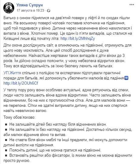 "Отец с сыном поднялись на девятый этаж в лифте и по лестнице пошли вниз. На восьмом этаже мужчина поставил мальчика на подоконник, чтобы он посмотрел в окно. Ребенок через незапертое окно наклонилась и выпал из окна. Мальчик умер. Это один из пяти случаев, произошедших в Киевской области только с начала лета", - пишет Супрун.