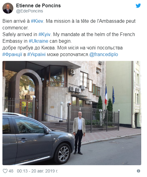 Новый посол Франции в Украине Этьен де Понсен прибыл в Киев. Об этом сообщается в Twitter-микроблоге дипломата в понедельник, 20 августа.