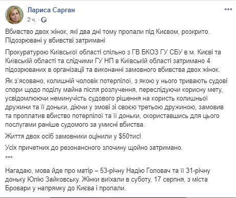 В субботу, 17 августа, по дороге с Броваров до Киева исчезли 53-летняя Надежда Головач и ее 31-летняя дочь Юлия Зайковская. Как сообщила в соцсетях пресс-секретарь генерального прокурора Украины Лариса Сарган, обеих женщин убили.