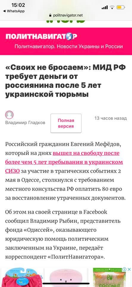 "Осторожно! В инете распространяется фейк о том, что российский гражданин Евгений Мефёдов , которого выпустили под залог из украинской тюрьмы, где он провёл 5 лет, придя в российское Генеральное консульство в Одессе столкнулся с формальным отношением и с него потребовали установленную плату за оформление документов , не приняв в расчёт все гуманитарные обстоятельства его случая. Повторю, это фейк, деза, ложь. Не поддавайтесь на провокации. Документы Евгению оформили вчера (Отправлены запросы в Россию и запущены необходимые процедуры) , плата не взималась. Российские представительства на Украине оказывают россиянину консульскую помощь", - написала она.