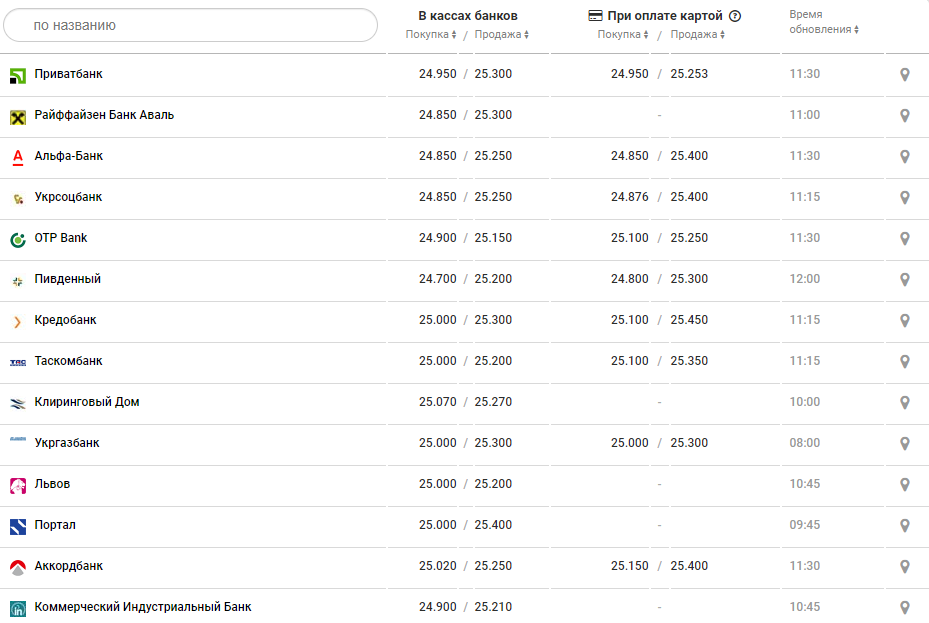 В банках курс доллара с утра был такой: покупка от 25 до 25,15 грн, продажа от 25,29 до 25,4 грн.