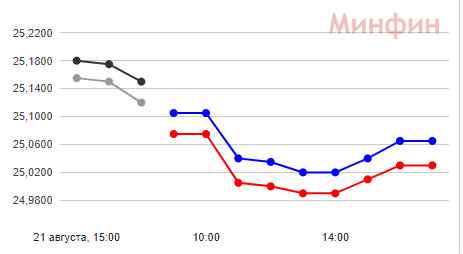 22 августа НБУ повысил курс доллара на 7 копеек, по сравнению с предыдущим днем, - до 25,20 грн. В обменках доллар к вечеру торговали по 25,13-25,18 грн. На межбанке доллар за день подешевел почти до 25 грн. В банках средний курс к вечеру также крутился около 25 грн: покупка 24,8-25 грн, продажа - 25,150-25,3 грн.