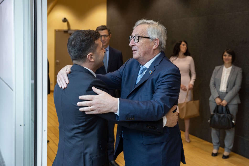 4 июня, во время первого зарубежного визита в качестве президента, в Брюсселе Зеленский встретился с главой Еврокомиссии Жаном-Клодом Юнкером. Они близко общались, весело шутили и крепко обнимались. "Очень классная у нас была встреча. Я не знаю, можно так говорить, или это недипломатично, но такой добрый, теплый, нормальный дядька. Очень умный человек. Классный такой мужик", - сказал Зеленский после встречи.
