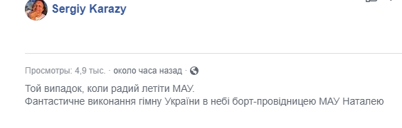 "Тот случай, когда рад лететь МАУ. Фантастическое исполнение гимна Украины в небе борт-проводницей МАУ Натальей", - написал он.
