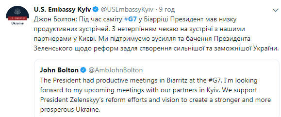 "Во время саммита G7 в Биаррице президент (Дональд Трамп - Ред.) провел ряд продуктивных встреч. С нетерпением жду встречи с нашими партнерами в Киеве. Мы поддерживаем усилия и видение президента Зеленского относительно реформ для создания сильной и более богатой Украины", - написал Джон Болтон.