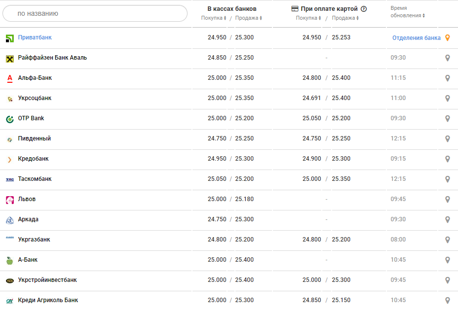 В банках курс доллара с утра был такой: покупка от 24,8 до 25 грн (покупка) и от 25,2 до 25,3 грн продажа.