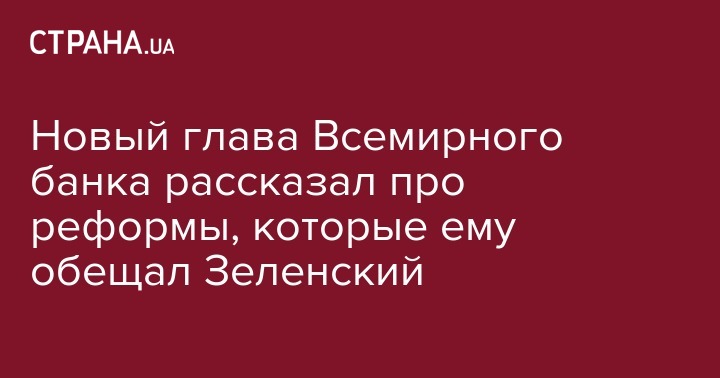 Президент Украины Владимир Зеленский во время встречи с президентом группы Всемирного банка Дэвидом Малпассом 22-23 августа подтвердил свои намерения провести земельную реформу, завершить процесс разделения "Нафтогаза", демонополизировать экономику и государственные предприятия, а также уважать независимость Нацбанка. Об этом Малпасс написал в своем блоге для Financial Time.