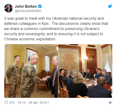 Советник президента США по национальной безопасности Джон Болтон заявил, что доволен встречами с коллегами из Украины и убежден в совместном видении безопасности Украины и угроз экономической эксплуатации со стороны Китая. Об этом Болтон написал в Twitter.