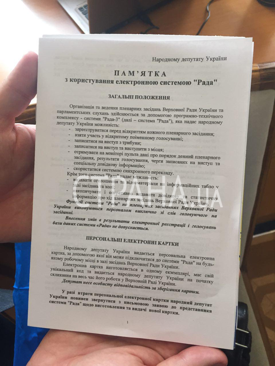 Итак, в подарочный набор депутата входят: записная книжка, папка, ручка, удостоверение и значки, конституция Украины, регламент. Каждому депутату также вручили памятку о том, как пользоваться сенсорной кнопкой во время голосования.