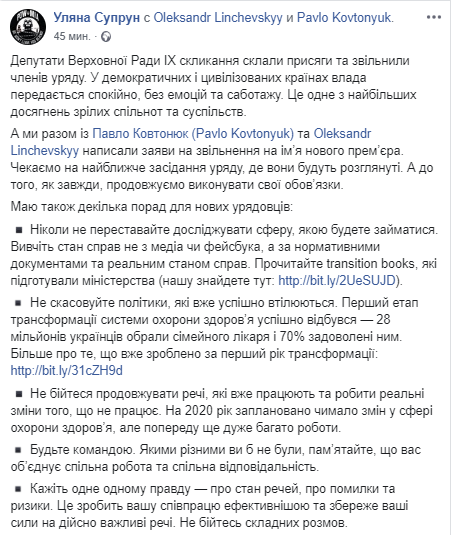 "Мы вместе с Павлом Ковтонюком и Александром Линчевским написали заявления на увольнение на имя нового премьера. Ждем ближайшего заседания правительства, где они будут рассмотрены. А до того, как всегда, продолжаем выполнять свои обязанности", – написала Супрун.