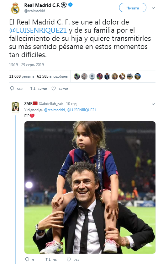 "Реал разделает боль Луиса Энрике и его семьи в связи с кончиной дочери. Клуб хочет выразить свои глубокие соболезнования в эти трудные времена", - говорится в соболезновании.
