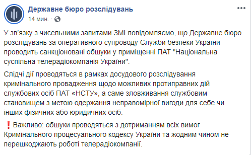 Глава НСТУ Зураб Аласания подтвердил, что Государственное бюро расследований действительно проводит обыск, ищут документы и флешки. Он отметил, что еще не полностью ознакомился с постановлением об обыске, но это связано с деятельностью НОТУ. "Пока все проходит мирно и спокойно", - добавил Аласания.