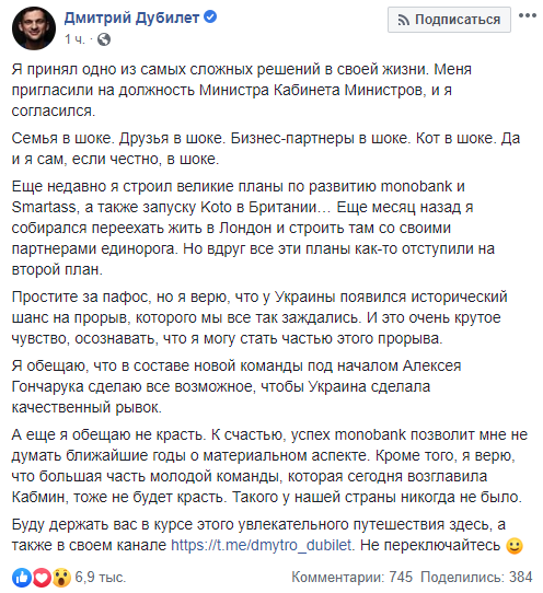"А еще я обещаю не красть. К счастью, успех monobank позволит мне не думать ближайшие годы о материальном аспекте. Кроме того, я верю, что большая часть молодой команды, которая сегодня возглавила Кабмин, тоже не будет красть. Такого у нашей страны никогда не было", - написал Дубилет.