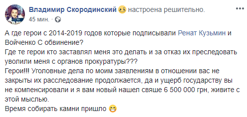 Где те герои, кто заставлял меня это делать и за отказ их преследовать уволили меня из органов прокуратуры???" - пишет на своей странице в соцсети Скородинский.