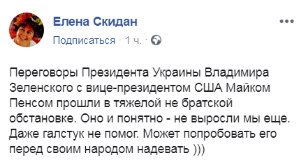 "Переговоры президента Украины Владимира Зеленского с вице-президентом США Майком Пенсом прошли в тяжелой не братской обстановке. Оно и понятно - не выросли мы еще. Даже галстук не помог. Может попробовать его перед своим народом надевать?" - высказалась Скидан.