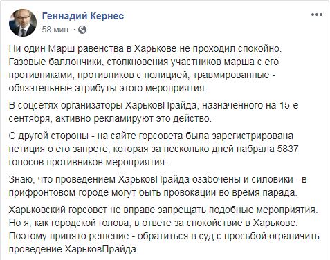 "В соцсетях организаторы ХарьковПрайда, назначенного на 15-е сентября, активно рекламируют это действо. С другой стороны - на сайте горсовета была зарегистрирована петиция о его запрете, которая за несколько дней набрала 5837 голосов противников мероприятия. Знаю, что проведением ХарьковПрайда озабочены и силовики - в прифронтовом городе могут быть провокации во время парада", - написал Кернес.