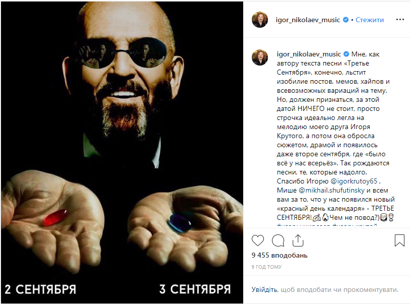 "Мне, как автору текста песни "Третье Сентября", конечно, льстит изобилие постов, мемов, хайпов и всевозможных вариаций на тему. Но, должен признаться, за этой датой НИЧЕГО не стоит, просто строчка идеально легла на мелодию моего друга Игоря Крутого, а потом она обросла сюжетом, драмой и появилось даже второе сентября, где "было всё у нас всерьёз". Так рождаются песни, те, которые надолго. Спасибо Игорю, Мише и всем вам за то, что у нас появился новый "красный день календаря" - третье сентября! Чем не повод", - написал Игорь Николаев.