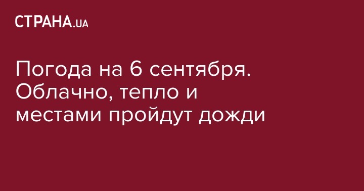 В пятницу, 6 сентября, в Украине будет переменно облачно, некоторые регионы накроет дождем. Ночью в восточных областях, Крыму, Приазовье, днем на севере Левобережья и в центральных областях дождь, гроза.