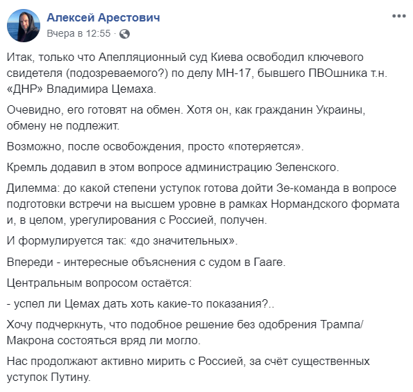 Другая группа комментаторов считает, что Цемах действительно ценный свидетель, но забрать удерживаемых в России украинцев - важнее геополитических преимуществ (тем более, пока еще призрачных).