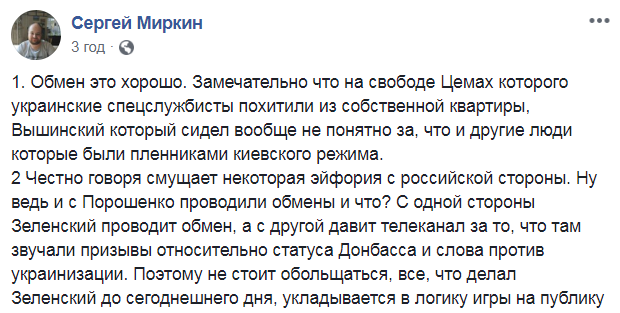 2. Честно говоря смущает некоторая эйфория с российской стороны. Ну ведь и с Порошенко проводили обмены и что? С одной стороны Зеленский проводит обмен, а с другой давит телеканал за то, что там звучали призывы относительно статуса Донбасса и слова против украинизации. Поэтому не стоит обольщаться, все, что делал Зеленский до сегодняшнего дня, укладывается в логику игры на публику", – написал Миркин.