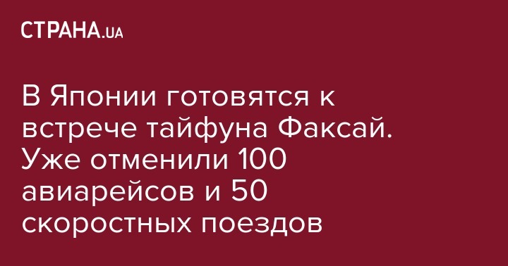 Больше ста авиарейсов отменили в Японии из-за того, что на страну надвигается мощный тайфун "Факсай". Кроме того, железнодорожные власти планируют отменить 50 скоростных поездов. Удар стихии ожидается завтра, 9 сентября, как сообщает "Интерфакс-Украина" со ссылкой на метеорологов.