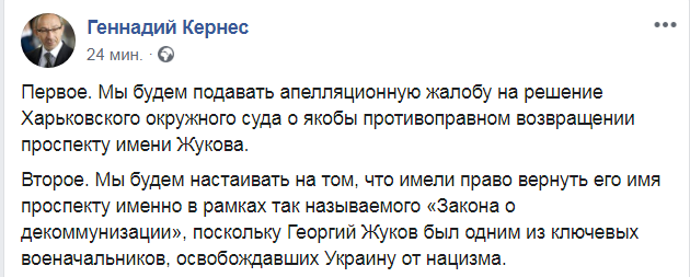 "Первое. Мы будем подавать апелляционную жалобу на решение Харьковского окружного суда о якобы противоправном возвращении проспекту имени Жукова. Второе. Мы будем настаивать на том, что имели право вернуть его имя проспекту именно в рамках так называемого "Закона о декоммунизации", поскольку Георгий Жуков был одним из ключевых военачальников, освобождавших Украину от нацизма", - поделился планами Кернес.