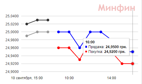 6 сентября доллар первый раз упал ниже отметки в 25 грн. 9 сентября валюта показала котировки в пределах 24,95/24,975 гривен за доллар. 11 сентября финансисты прогнозируют дальнейшее проседание котировок по доллару в пределах 24,60-24,65 гривен.